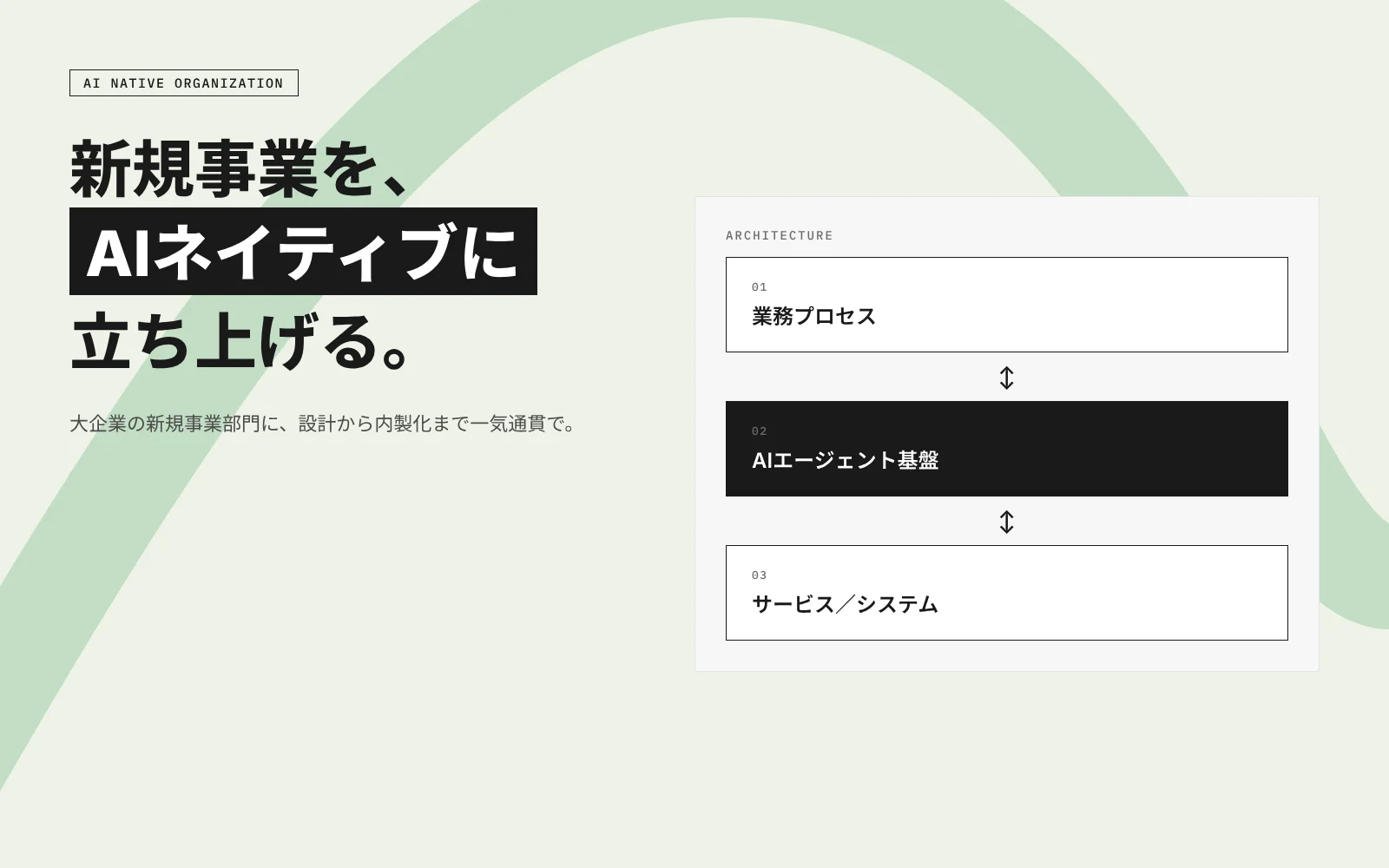 事業を、AI を前提にゼロから設計し直します。業務もプロダクトも AI ネイティブに作り変えることで、事業成果に直結する変革を実現します。