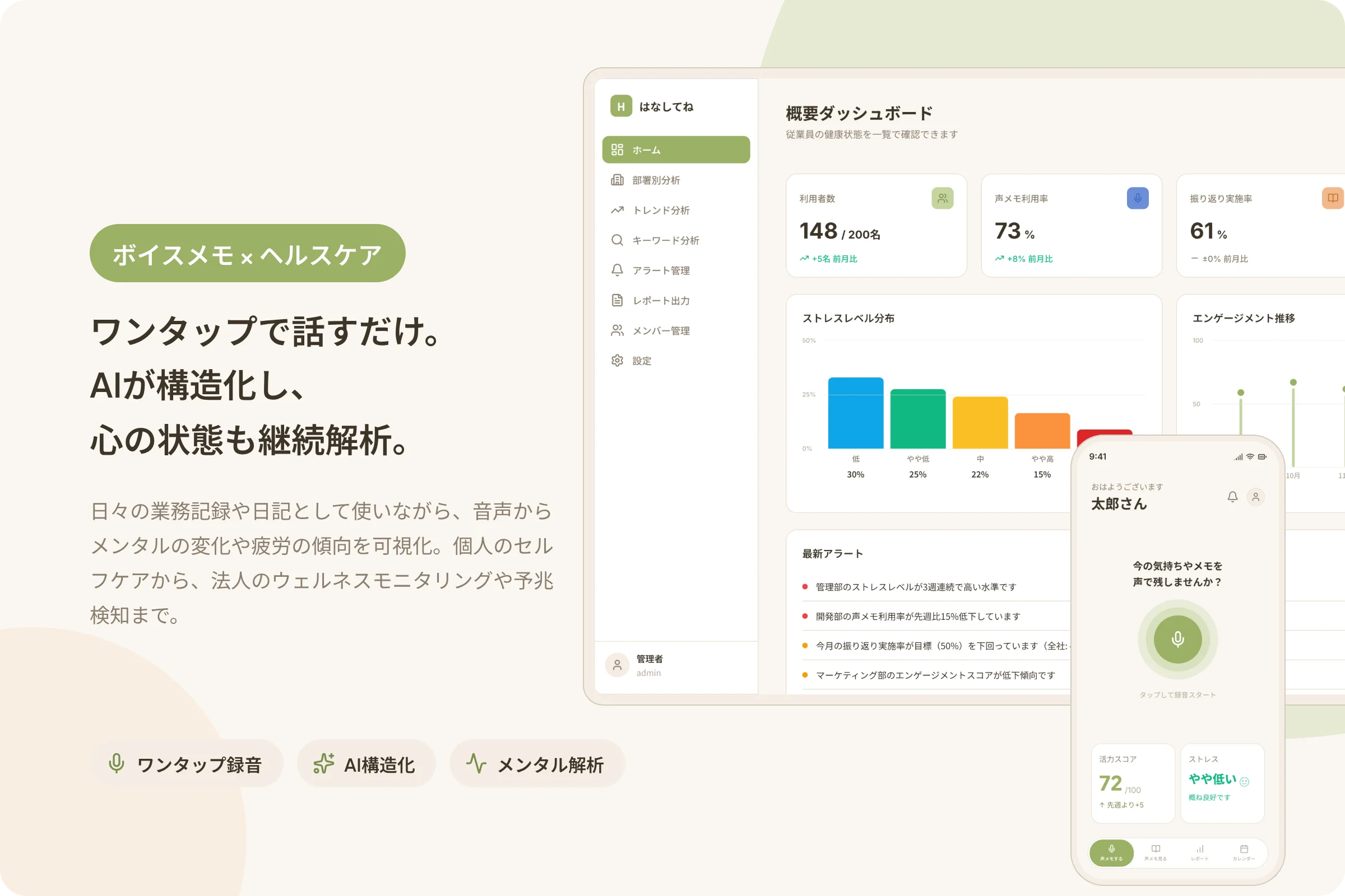 ボイスメモ × ヘルスケア。ワンタップで話すだけで AI が内容を構造化し、メンタルの変化や疲労の傾向を継続的に解析。個人のセルフケアから法人のウェルネスまで活用できます。