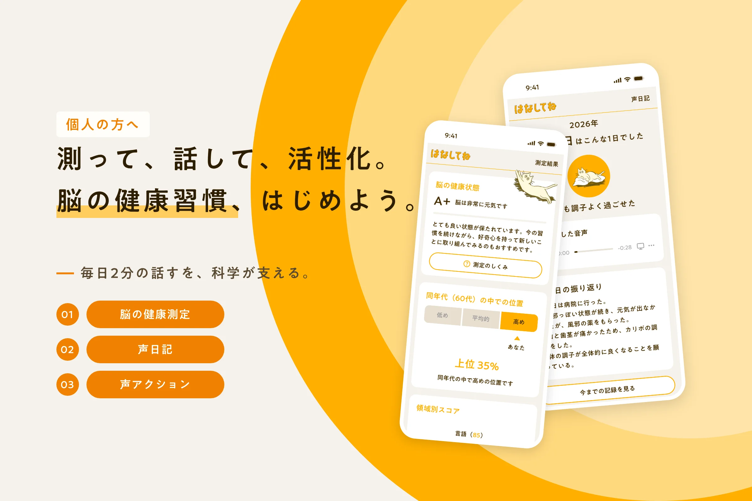 2 分間話すだけで脳の健康状態を可視化し、日常生活の中で脳の健康増進につながるアクションを提案する健康習慣サービス。50〜70 代を中心に、脳と心の健康をセルフチェックできます。