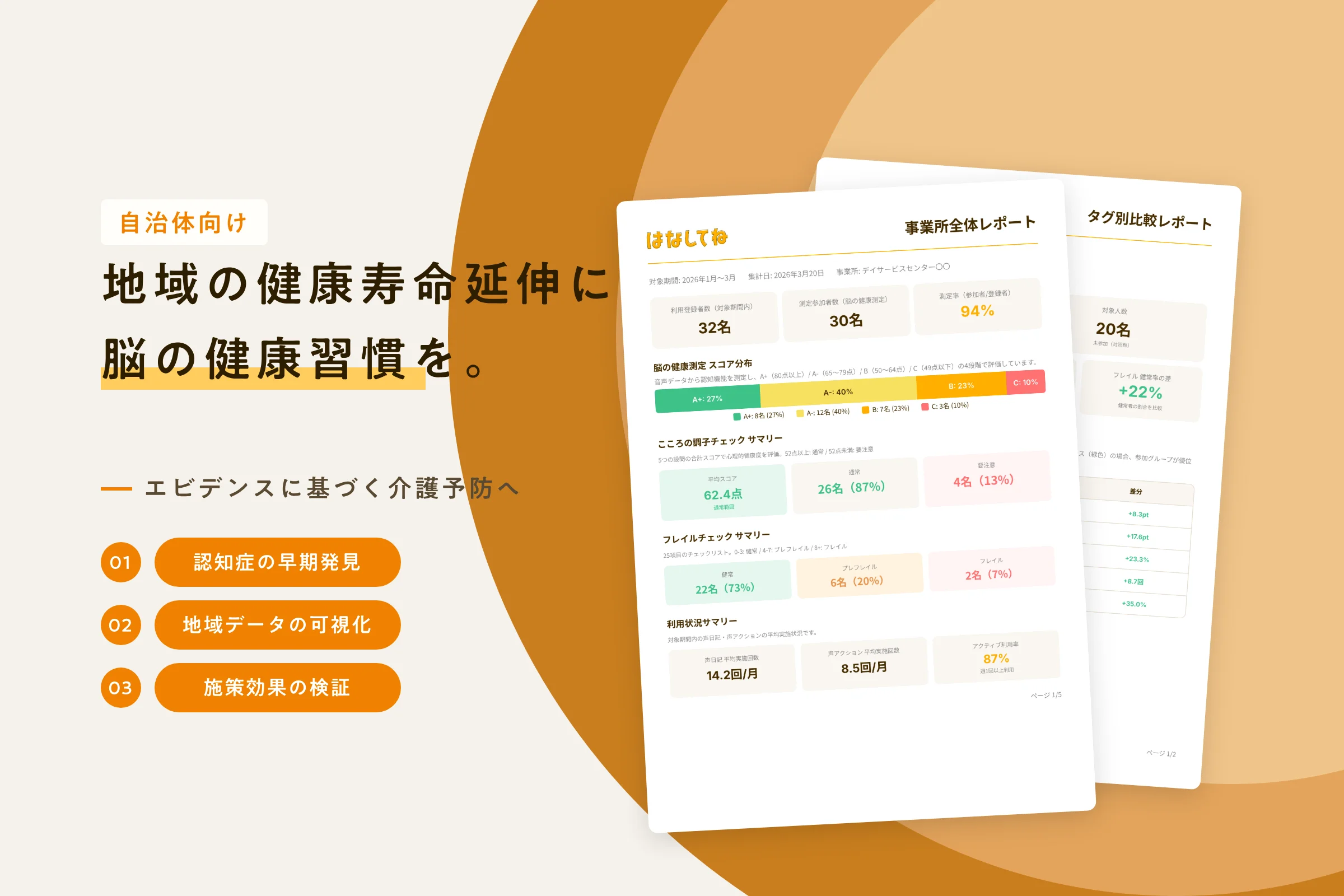 自治体の介護予防・健康増進事業に、音声を用いた脳の健康測定と継続的な健康管理を提供。住民向けの無理のない接点設計から、事業評価までを伴走します。