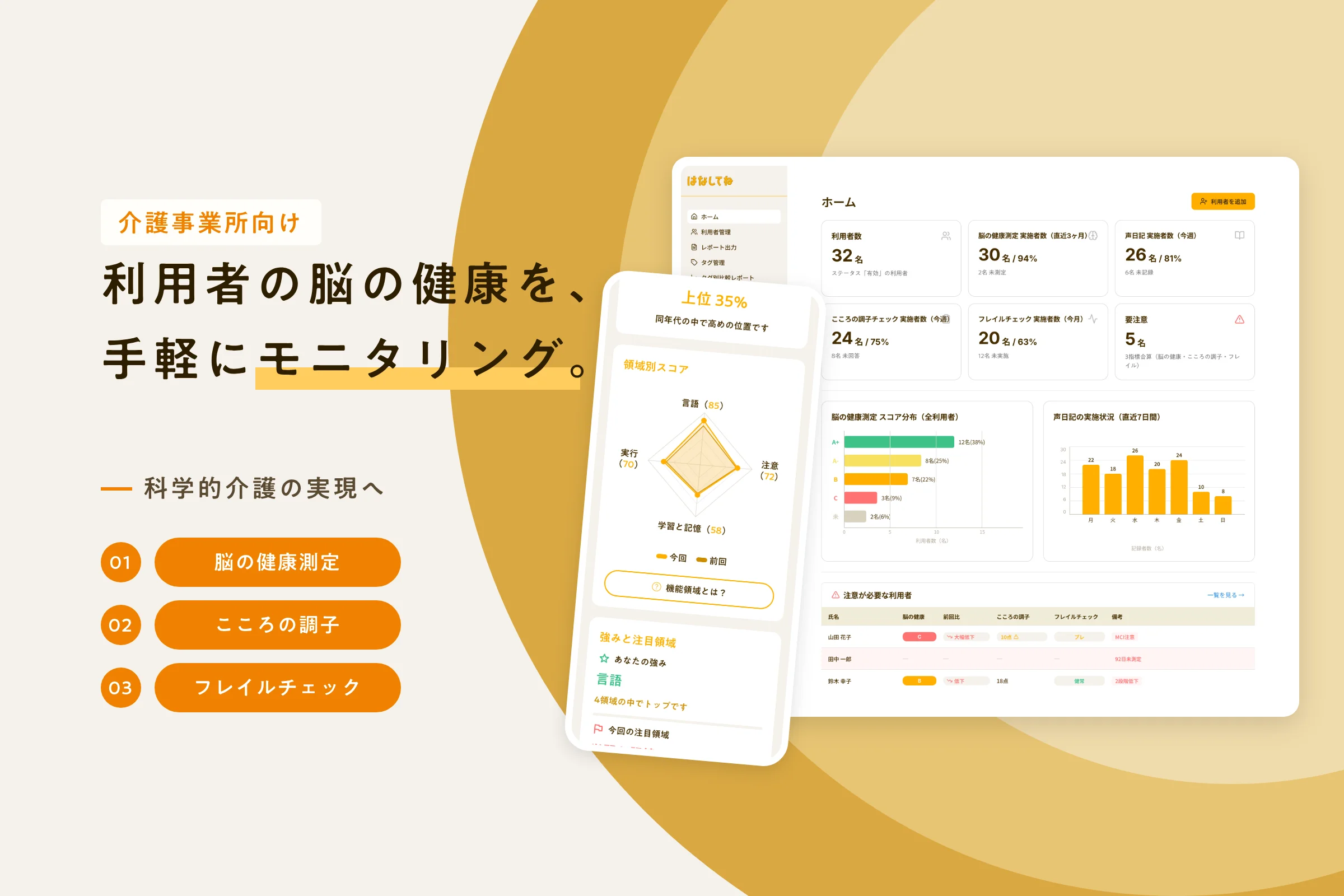 介護現場での認知機能モニタリングと、ケア計画への示唆出しを支援。事業所向けダッシュボードで利用者ごとの変化を可視化し、早期対応の判断材料を提供します。