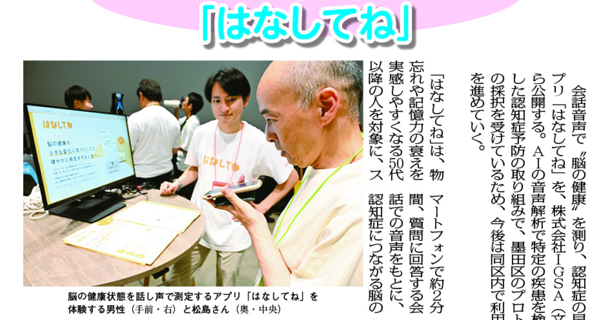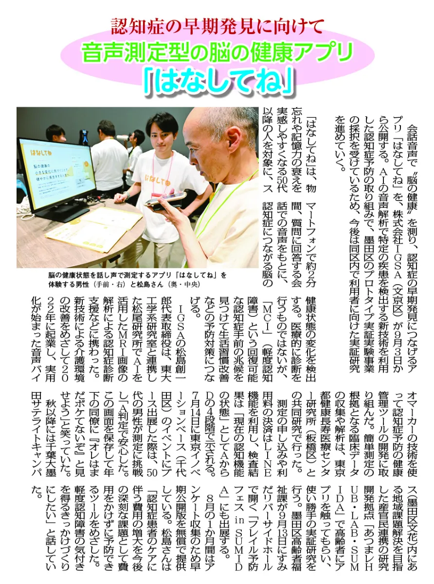 東都よみうり新聞、2025年8月22日号に、「認知症の早期発見に向けて音声測定型の脳の健康アプリ『はなしてね』」として掲載されました。