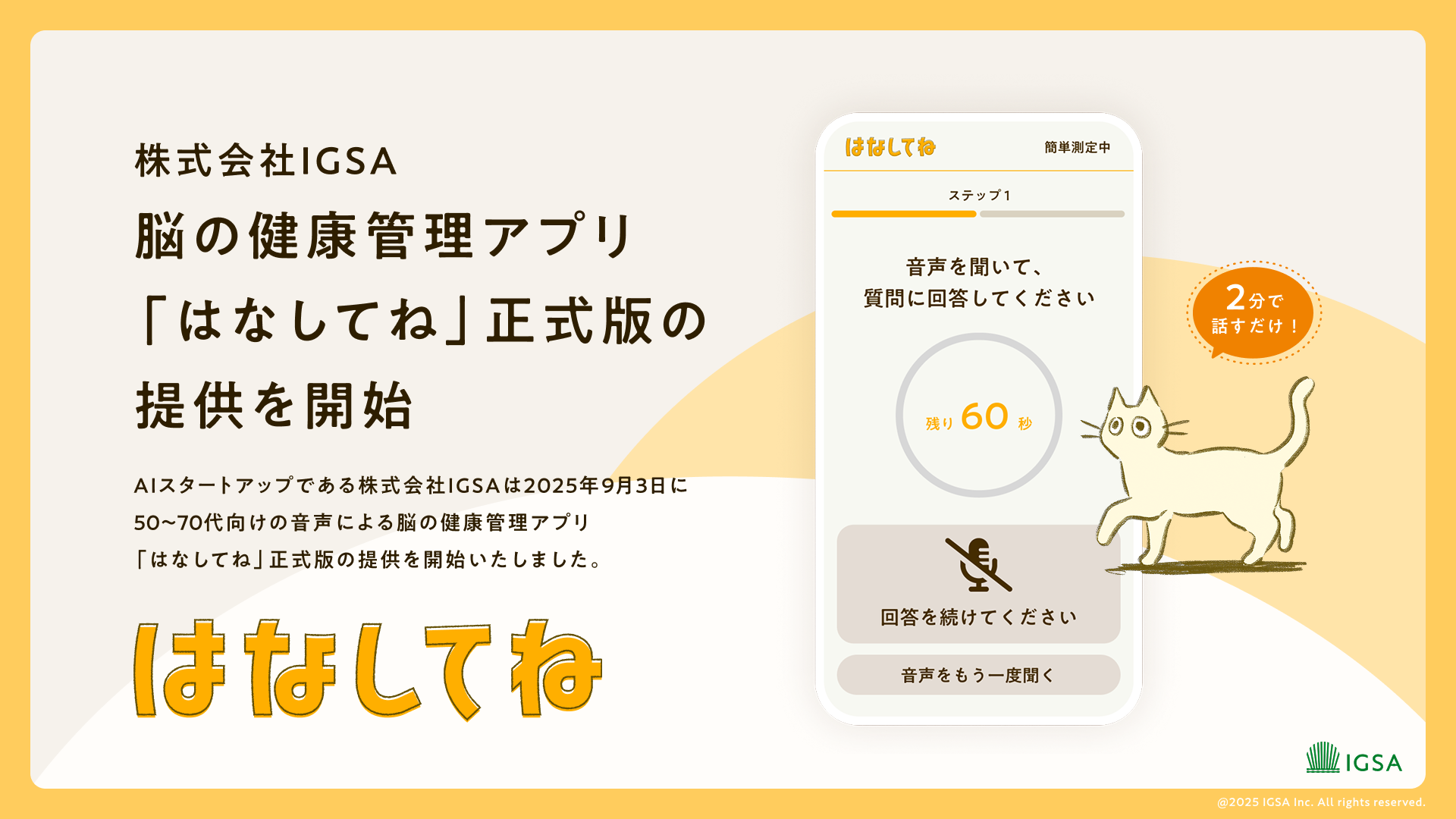2分の音声で脳の健康をチェックするサービス「はなしてね」を、8月1日より早期公開版として無償提供開始
